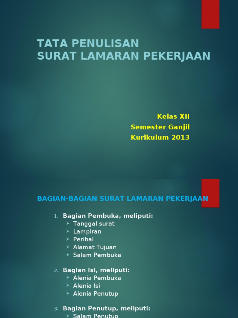 Materi Bahasa Indonesia Kelas 12 Bab 1 Portal Edukasi from portaledukasi.org Nah, berikut adalah struktur surat lamaran pekerjaan yang baik dan benar. Cara membuat surat lamaran kerja. Tanggal dan tahun penulisan surat lamaran kerja. Bagian surat diawali dengan pernyataan umum (tesis), yaitu bagian surat lamaran pekerjaan yang menyajikan pengantar surat pernyataan umum ini berfungsi sebagai informasi awal terkait dengan pekerjaan yang akan dilamar. Berikut contoh potongan bagian pembukaan dalam surat lamaran kerja. Selain itu, jika kamu sudah memahami ciri, unsur, dan bagian yang terdapat pada surat lamaran pekerjaan, maka kamu akan bisa membuat surat lamaran pekerjaan dengan mudah. Pada saat membuat surat lamaran kerja setidaknya menggunakan tulisan yang benar, dengan menunjukan bahwa anda merupakan seseorang yang profesional dan juga beretika. Surat lamaran kerja sering kali dianggap sama dengan sampul surat atau cover letter dan memilki bentuk yang hampir mirip.