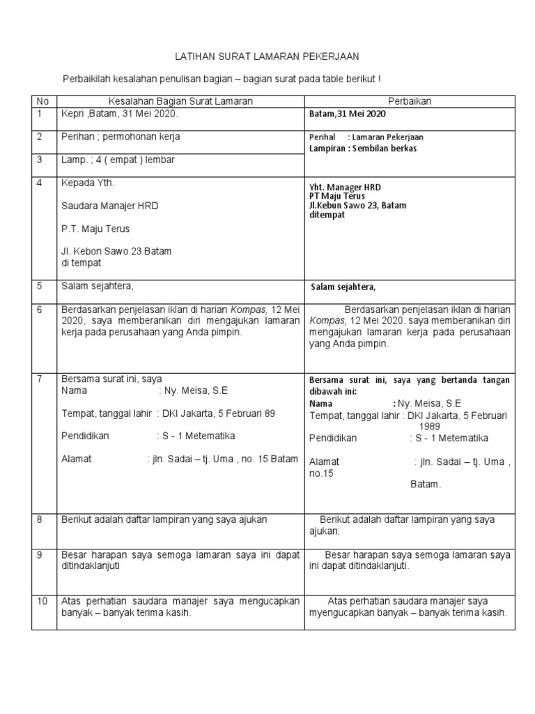 Surat lamaran pekerjaan adalah surat dari seseorang yang memerlukan pekerjaan (pelamar) kepada orang atau pejabat suatu perusahaan yang dapat memberikan pekerjaan. Pada bagian atas surat lamaran kerja cantumkan nama lengkap dan gelar, alamat lengkap anda, nomor telpon anda, hp dan rumah, alamat email. Selain itu, surat ini juga harus memiliki sistematika atau struktur yang benar agar mudah dipahami rekruter. Struktur surat lamaran kerja & contohnya. Daftar riwayat hidup berisi profil pelamar, pendidikan formal dan atau informal, pengalaman organisasi, pengalaman magang, pengalaman kerja, kegiatan yang pernah diikuti, dan capaian prestasi. Tempat, tanggal pembuatan surat 2. Hrd pt raja muda karang perkasa Surat lamaran kerja harus memuat informasi yang lengkap. Kota dan tanggal pembuatan surat. Surat lamaran kerja semarang, 10 januari 2019 kepada yth. Nama dan alamat tujuan surat. Surat lamaran kerja yang baik dapat memperbesar peluang untuk maju ke tahap rekrutmen selanjutnya. Pada saat membuat surat lamaran kerja setidaknya menggunakan tulisan yang benar, dengan menunjukan bahwa anda merupakan seseorang yang profesional dan juga beretika.